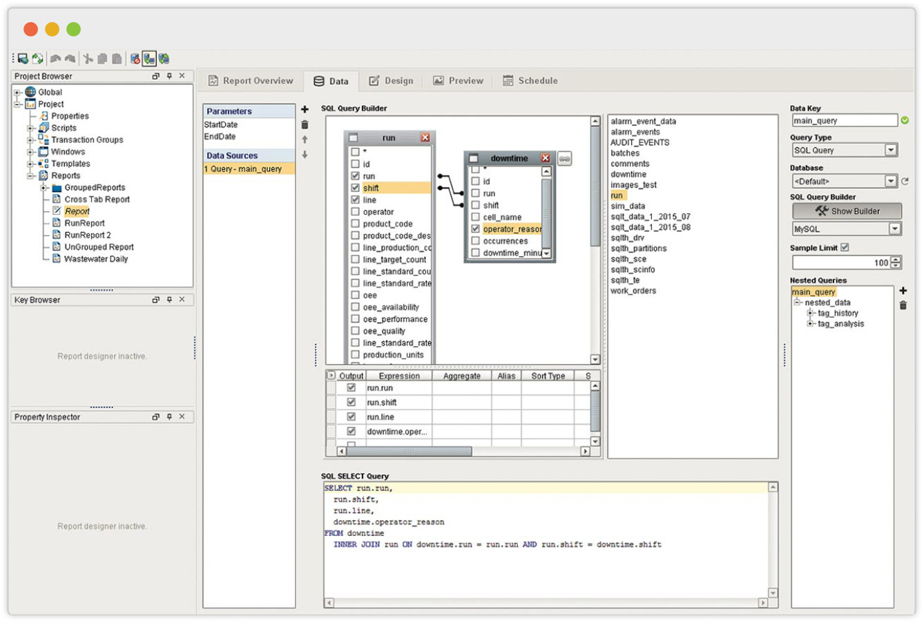 The Reporting Module has a powerful drag-and-drop query interface that allows you to build complex SQL queries easily. The new query structure allows you to create complex nesting which can correlate relational data and process-historian data in a seamless fashion.