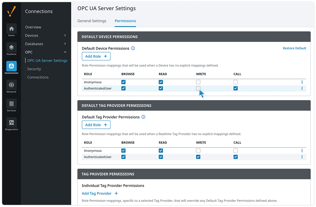 Ignition provides a wide degree of system control, putting you in the driver's seat of your security strategy. Use Ignition’s OPC UA Roles feature to pick and choose which operators, officers, and third-party users have access to specific devices or tag providers — and control the read and write permissions granted with that access.